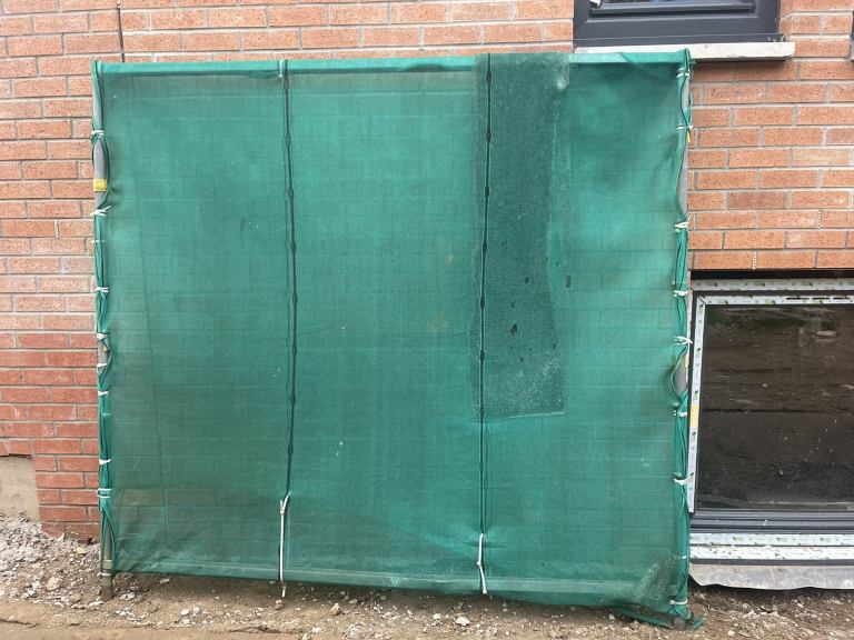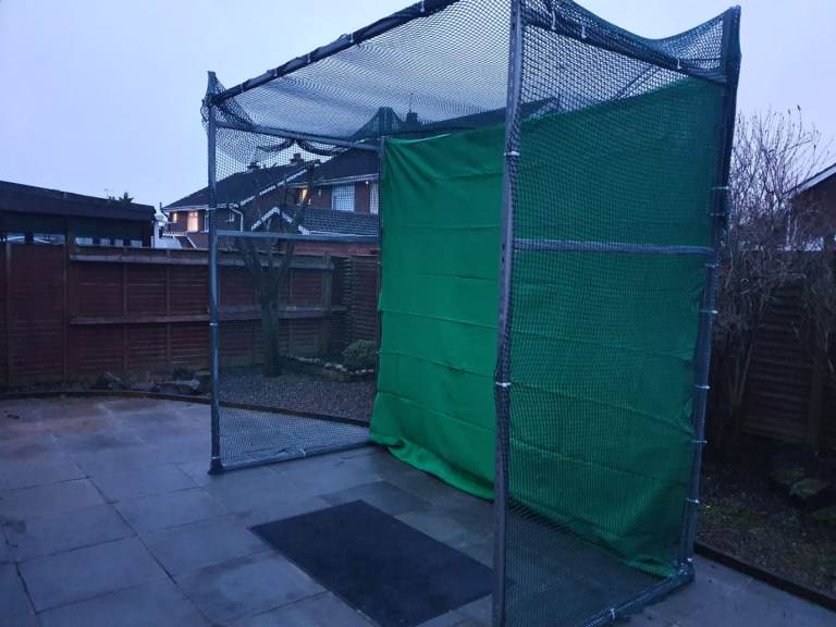Golf practice netting. Installed previously to make approx 3m wide by 3m high by 1.5m deep bay. Has been dismantled and sitting in garage around 1 year. Sides and top made up of wide squared cargo style net. Back impact panel is solid net. C