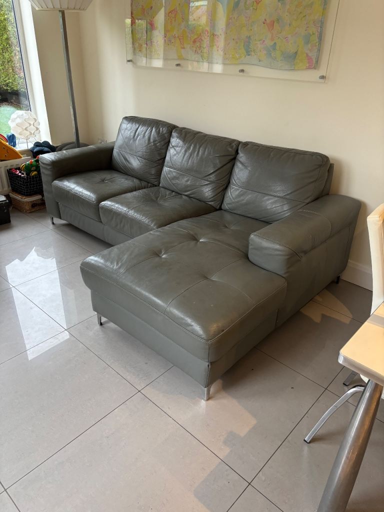Grey Leather Modern Style L Shape Sofa No Rips or Burns Few Age Related Marks but Still Very Presentable Splits in Two To Make Transporting Easier Dimensions-Length 228cm Depth 88cm Height Back 84cm Front 44cm