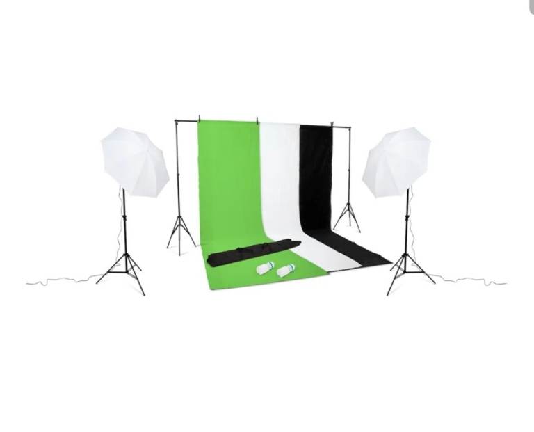 Kenley Pro Photo Studio Background Stand Kit with 2 x 3 m Stand, 2 x 3 m Cotton BWG Backdrops, Lighting and Umbrellas Only used lights once, everything still in box. Open to offers
