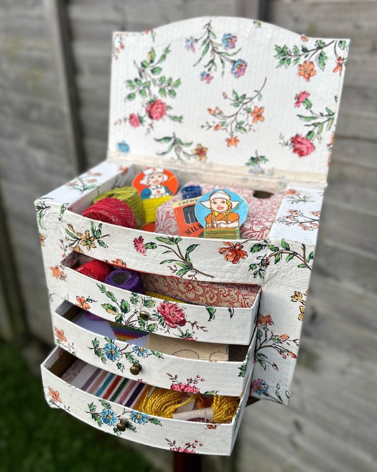 This 1950s cardboard sewing drawer set may have been a starter kit for young children. Comes with lots of content. It has been repaired at some stage, but it’s no less lovely for that.