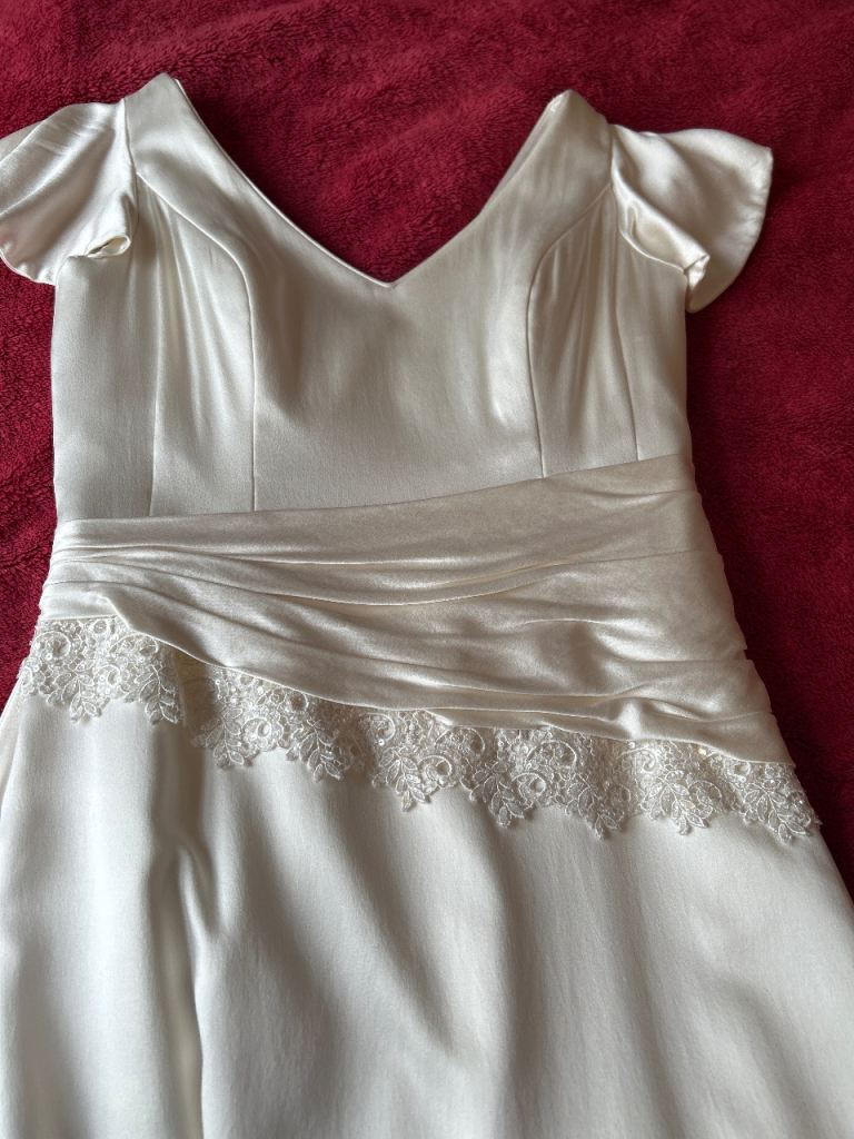 Beautiful Justine Mireil cream/champagne satin dress size18 but altered to more of a 16. Slightly boned at bust line . Cap sleeves . Fixed sash at waist with lace appliqué front and back . Back zip. Short train at back . Professionally dry clea