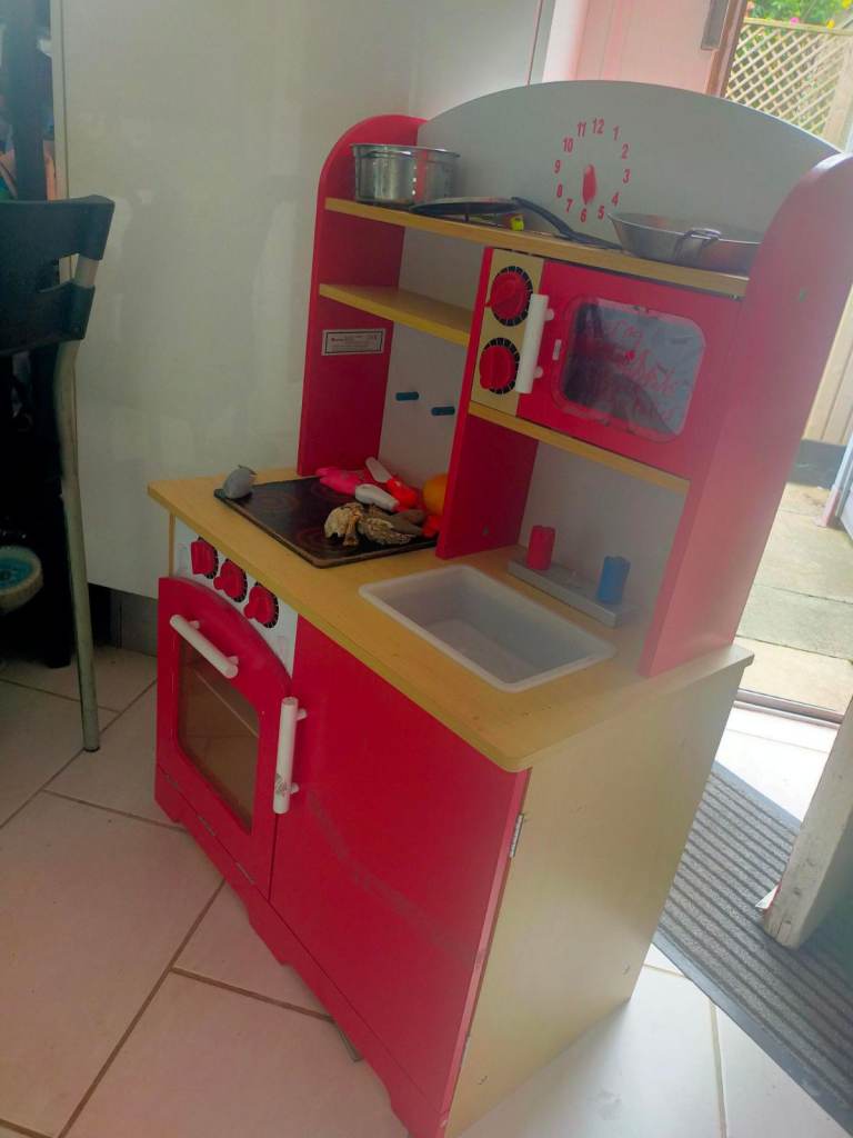 A lovely kitchen set, ideal for home role play. About a meter tall and 0.5m wide. In timber, quite light