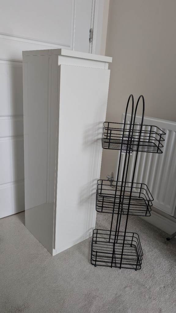 White bathroom cabinet + black bathroom caddy The black caddy has never been used in great condition 72cm h x 22cm w x 16cm d The White cabinet is in good condition but the top has started to turn cream from the sun, there's a slight mark on