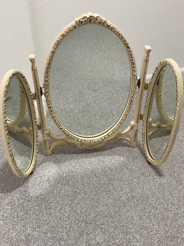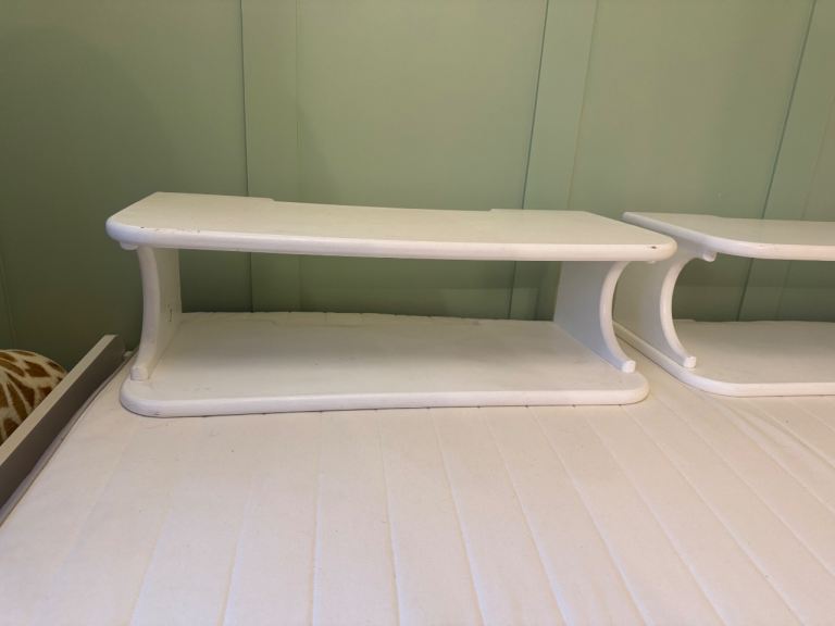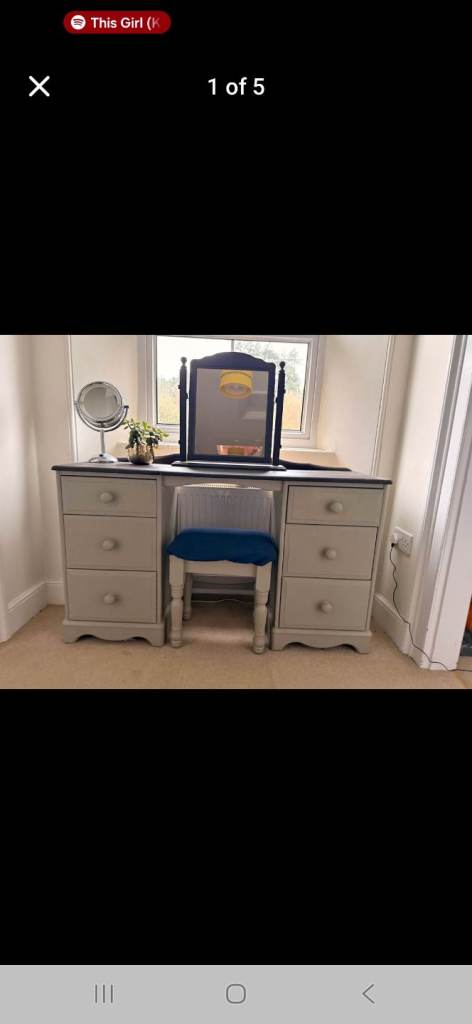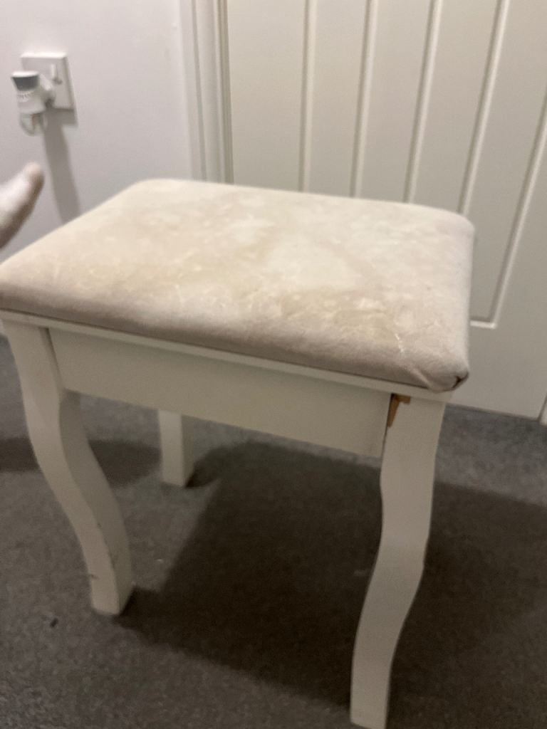 I used this as a dressing table, great for saving space Made of solid heavy wood £10 each of both for £15. A couple of scrapes as pictured can be re-painted. Hight 25 Width 35 Length 80