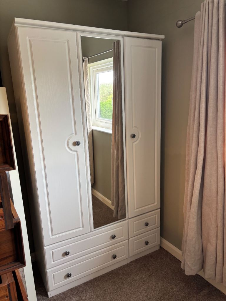 3 door wardrobe with mirror and draws, very good condition just a slight mark on top of mirror door (pictured) 2x chest of draws matching also available and can be sold in bundle Ready for immediate collection