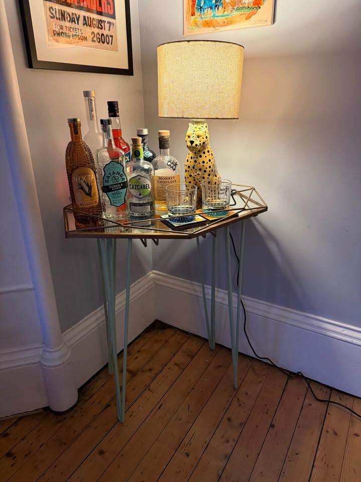 Gorgeous bar table, custom made by a craftsperson (was £150 new but still in impeccable condition). Mirror top, brass upper and metal hairpin legs in a beautiful teal color. Has wine glass racks underneath. High quality craftsmanship, truly a one of