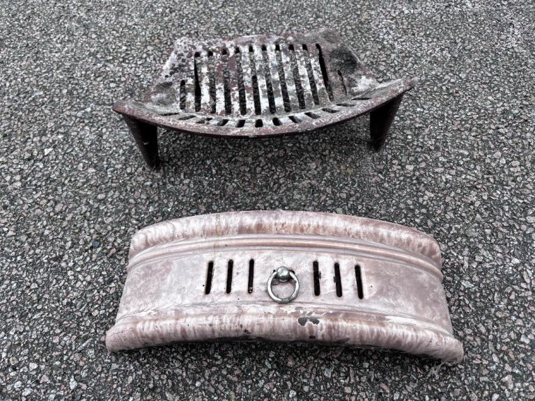Cast iron fire insert and grate plus black granite hearth (available together or separately). The insert looks a bit dusty in the photos,but it’s just lime wash (chalk) from decorations and can be easily wiped off. I’ll include a pot of cast iron