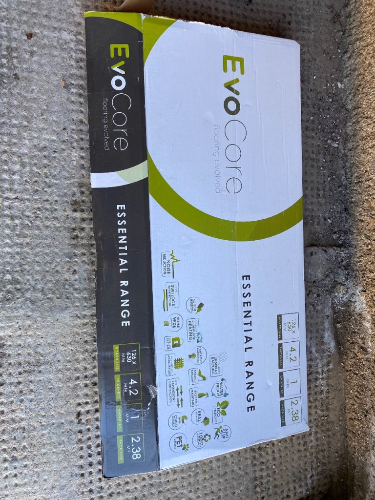 1 opened box of Evo Core Vinyl Flooring with one board used. Dimensions on box - would suit small space. Herring bone design in cloudy white oak - photo of kitchen to show finished effect. Strictly collection only thanks