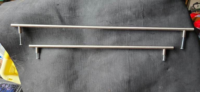 2 sizes of used brushed chrome kitchen cabinet door handles: 18 - 65.5cm long with 59.9cm between screw holes 7 - 53.5cm long with 47.5cm between screw holes Solid metal and most in good condition.