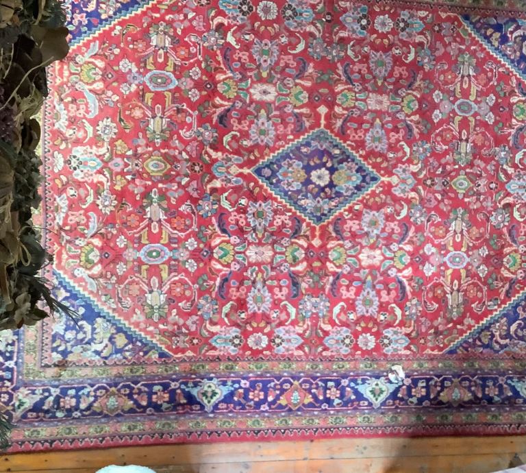 The diamond-shaped centerpiece is typical of many Persian patterns. eg.Tabriz & Heriz Color is rich reds with deep blues and ivory accents—very classic. Floral and vine patterns suggest a high level of craftsmanship. Multi
