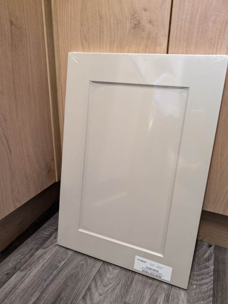 B&Q, Kitchen Kit Shaker Sample Kitchen Unit Cabinet Door 396mm - Ultra Matt Cashmere 570mm x 396mm Still in the original wrapping. It's a proper heavy door can be used as an actual cabinet door. Collection at EH8.