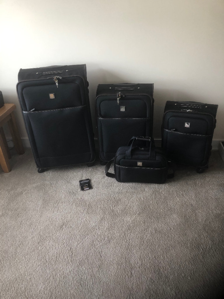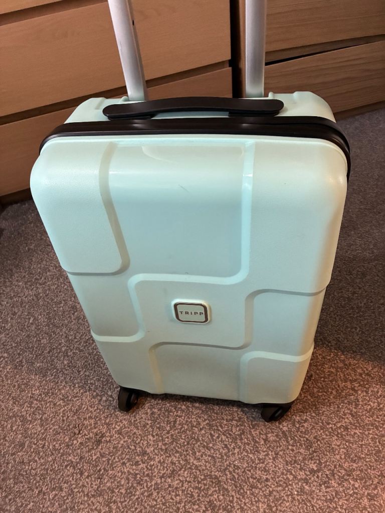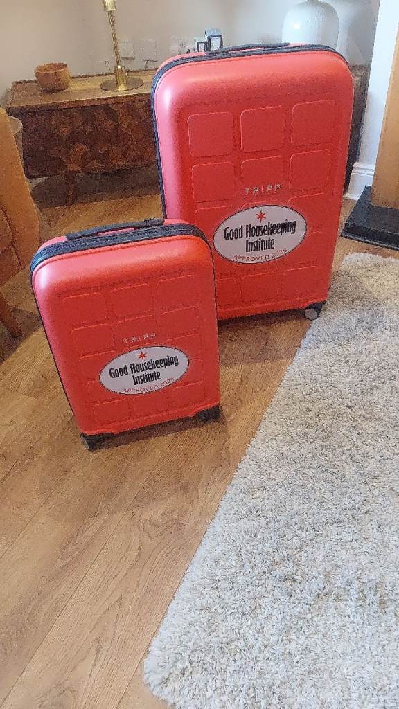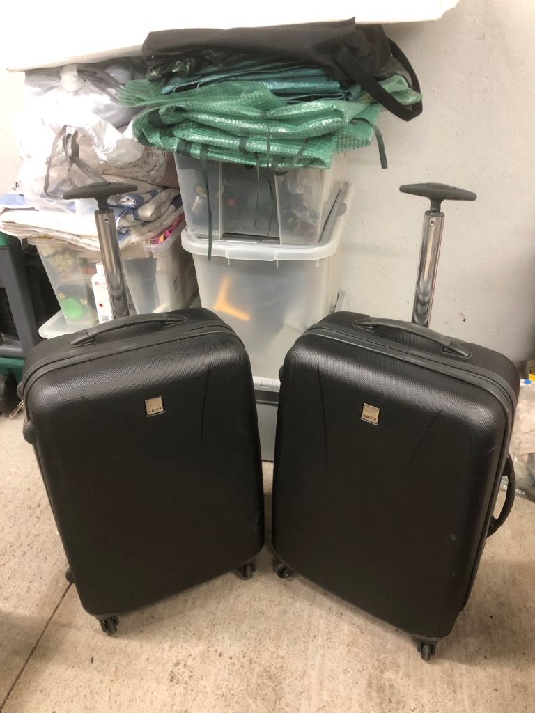 Matching pair of wheelie suitcases. Well used but still good working condition. One has had a bash which popped back out. Still waterproof. Very clean inside.