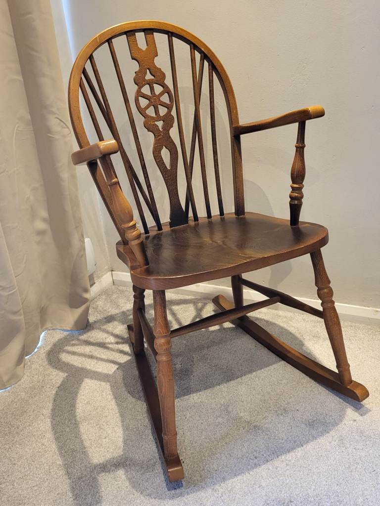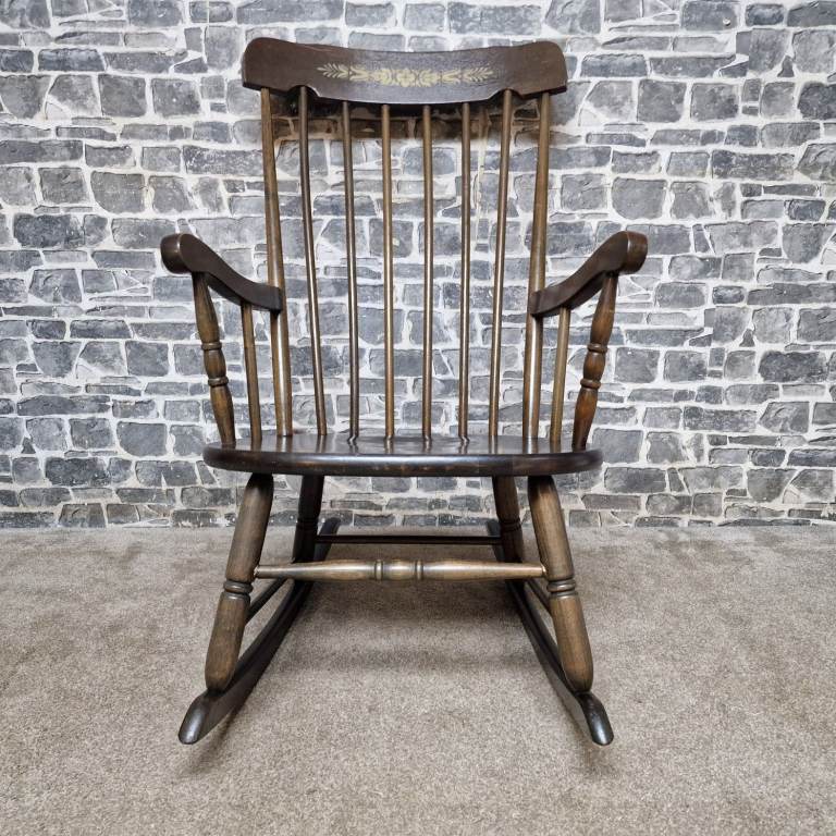 Traditional solid wood Windsor-style rocking chair with a high spindle back and shaped armrests. Finished in a warm dark wood tone, it has a classic country and farmhouse look that works well in living rooms, bedrooms or reading corners. The chair