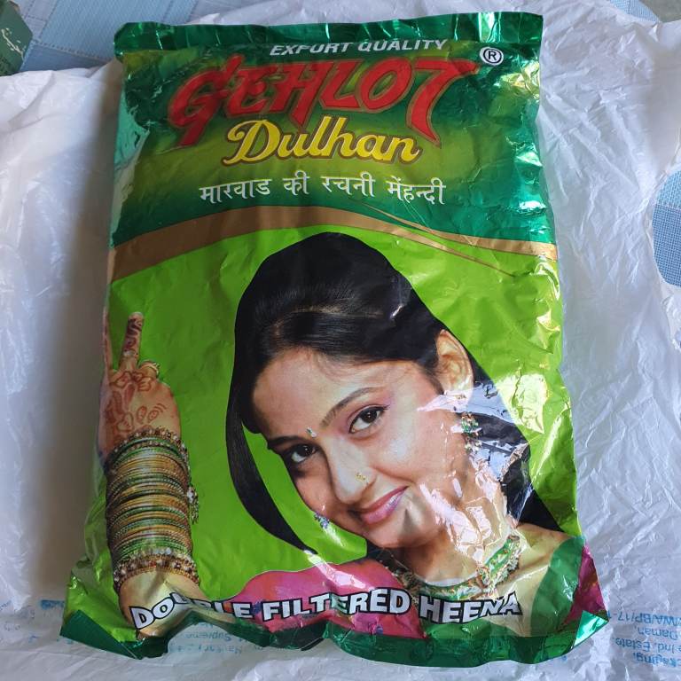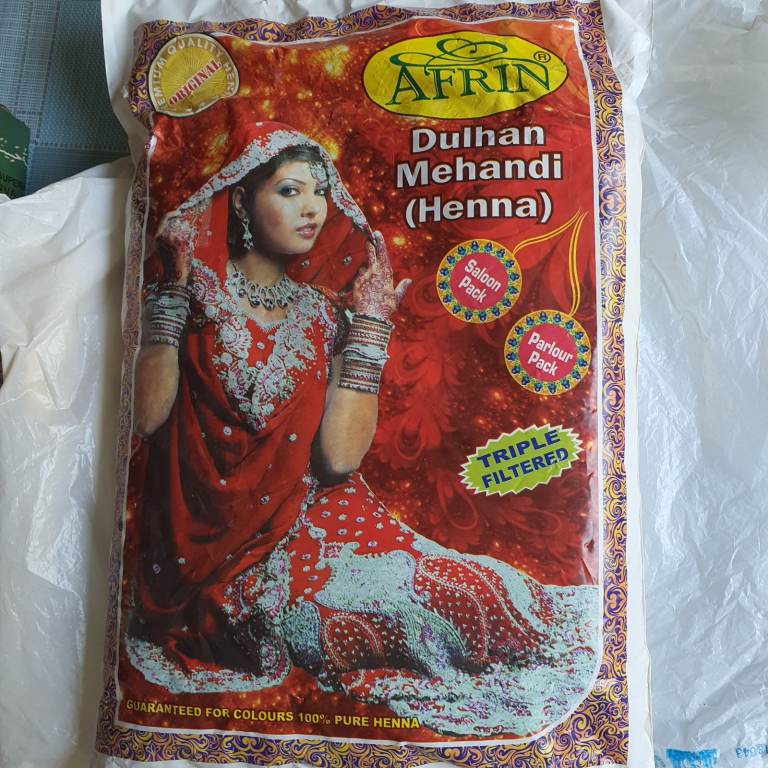 Triple filtered, professional quality henna / mahendi powder in 1 kg pack. Originally bought from Mumbai. Other items also available for henna artists: tea oil, cone making cellophane and stencils. Suitable as hair dye.