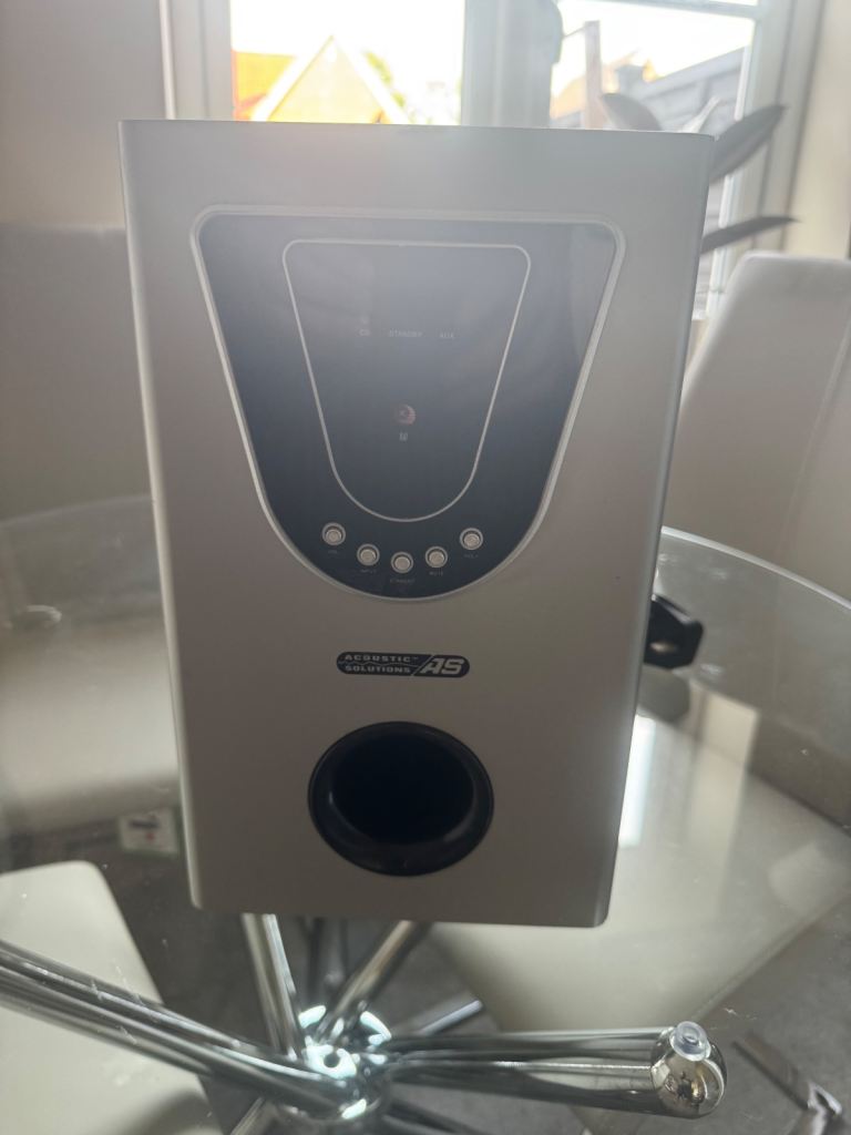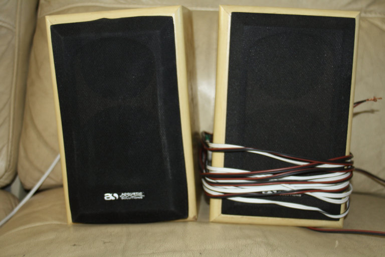 Acoustic Solution Speakers. Very Good Condition. Solid Build and perfect where space is a problem. Great response. 50 watt-90 watt handling each speaker unit.Model Number acoustic solutions av-20 Mk 2 . 14.5 cm wide x 19 cm deep x 22.5 cm high.. Supe