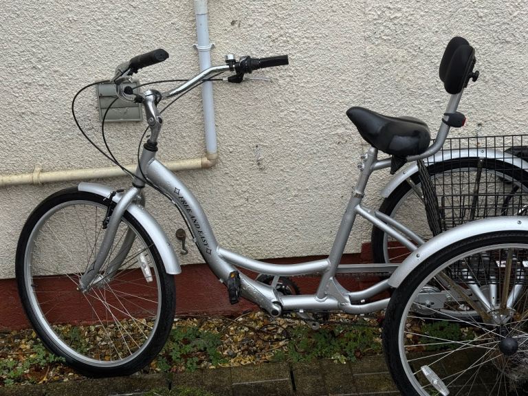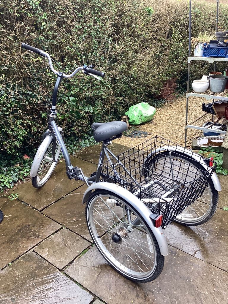 Mission Cycles adult tricycle, Space Genie 24. Front wheel folds in. Ideal for fun and mobility issues. Basket at rear. Bought for £300, gears serviced at the time, never used. Sell for £150 collection only.