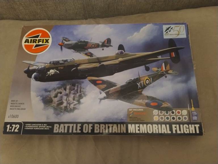 Airfix Battle of Britain Kit. Lancaster. Spitfire & Hurricane. Never constructed, most plastic kit bags unopened. Box in good condition. Paints and cement in plastic bag. Good to Very Good condition.