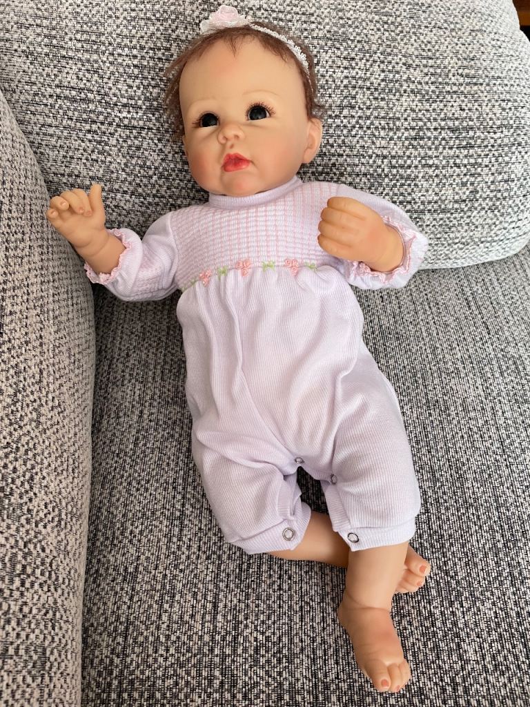 The Ashton Drake Galleries baby doll Olivia’s Gentle Touch is a 55cm baby girl doll. Her hand closes around your finger, I have put batteries into her and she does work. I do not have her certificate, socks, or original box but otherwise she’s in a g