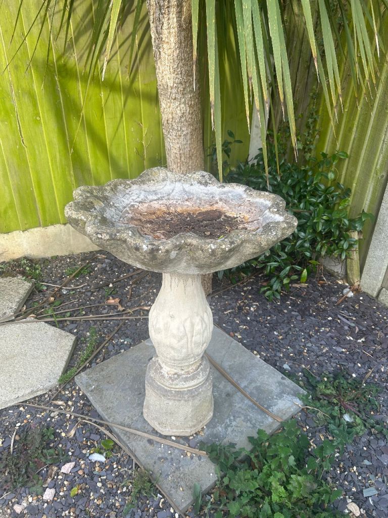 Stone garden out doors bird bath 2 parts top and bottom. Not very big small bird bath. Was used but no longer wanted.