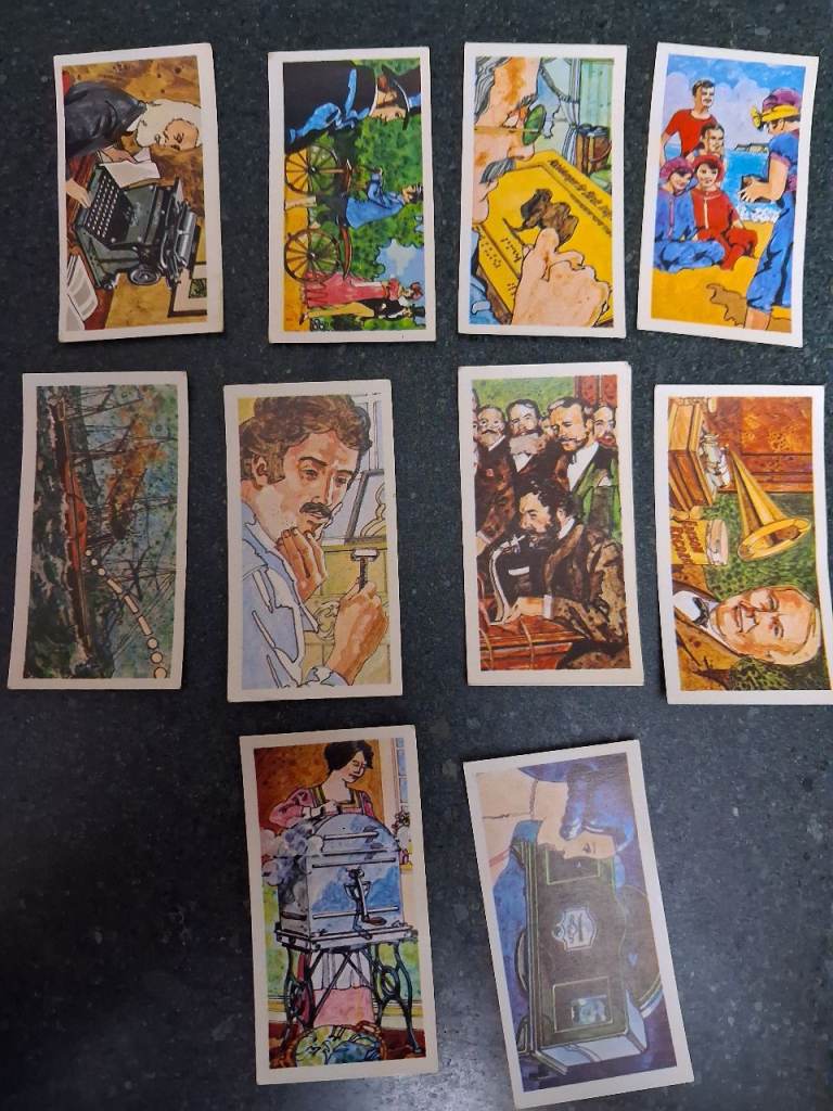 Brooke Bond cards - INVENTORS ABD INVENTIONS. Card numbers 14, 22, 23, 28, 29, 31, 34, 35, 36, 42 from a set of 50. Cards are in good condition