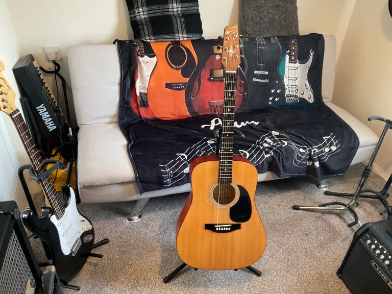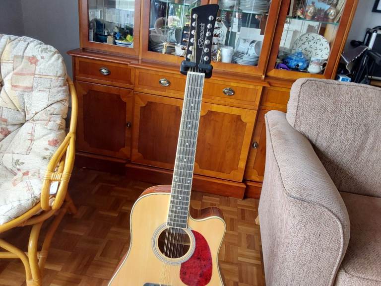 Low action, very easy to play, surprisingly stays in tune . Usually kept in standard tuning. Big booming well balanced tone. Spruce top and Sapele/mahogany back and sides. Top bout 29.5 cm wide and 10cm deep. Bottom bout is 40cm wide and 12 cm dee