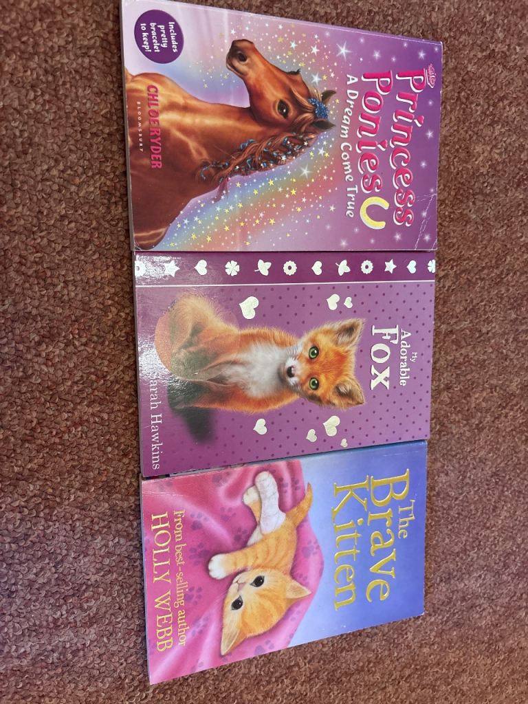 Bundle of three children's books in good condition, perfect for young readers. Includes 'Princess Ponies: A Dream Come True' by Chloe Ryder, 'My Adorable Fox' by Sarah Hawkins, and 'The Brave Kitten' by Holly Webb. Spines and pages are in good shape