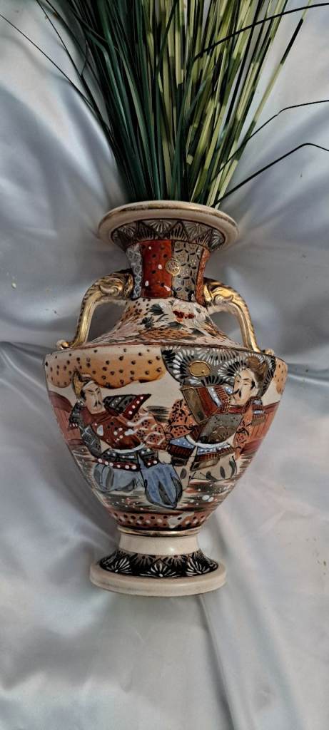 One Old but very decorative vase with warriors and elephant handles markings on base