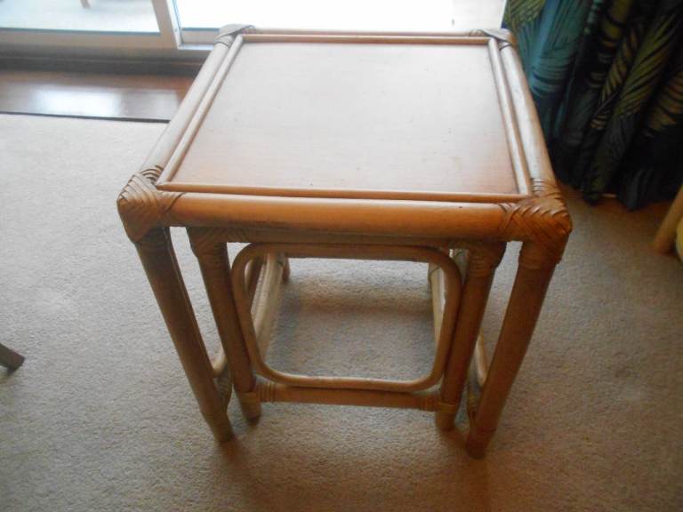 Nest of two cane conservatory tables Reasonable condition, sizes 40cm square, and 32cm square Collection from Bampton