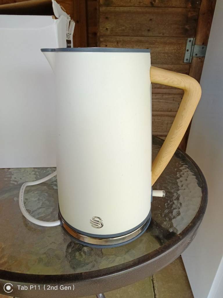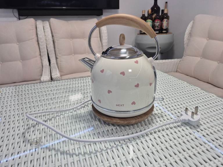 Lovely kettle from Next finished in cream with pink hearts and wood base and handle. This kettle is in as new condition and less than 12 months old. Selling as changing colour scheme in kitchen.