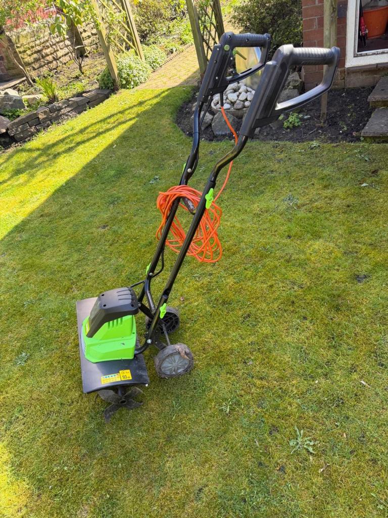 An electric tiller or cultivator, from brand Draper. It features a powerful electrical motor to 1500W, designed to turn soil in vegetable patches or flower beds. The machine has six steel blades (tines) for effective soil cultivation and weeding. I