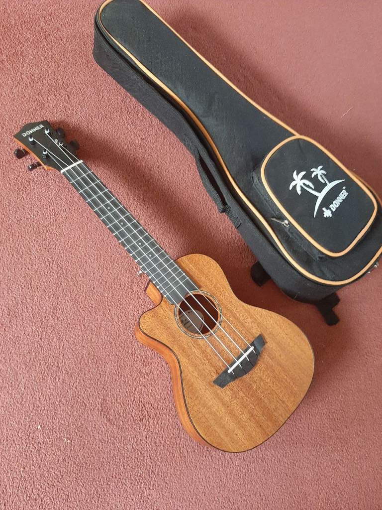 Beautiful left handed cutaway ukulele made by Donner. Includes well made fitted case.