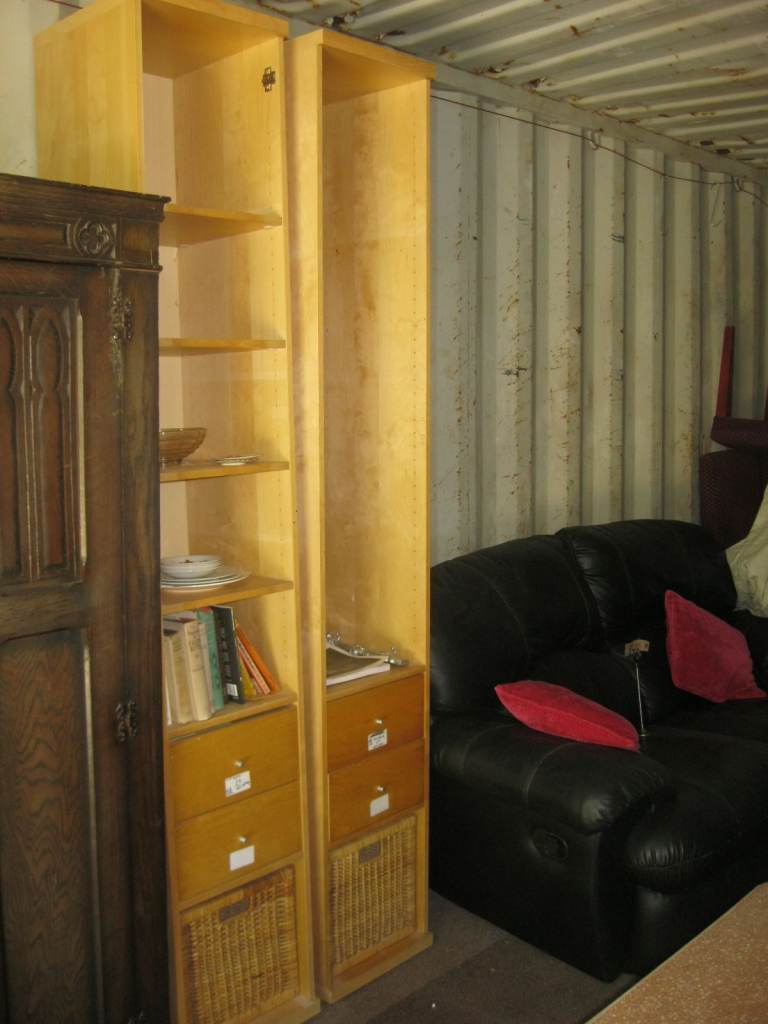 TALL SLIM DISPLAY SHELVING - BOOKCASE, 5 TIERS WITH MID TWIN DRAWERS OVER FITTED DETACHABLE WICKER BASKET. VERSATILE LOCATION USAGE (2ND MATCHING SHELVING ALSO AVAILABLE, NO SHELVING £10) IN GOOD ORDER W37CM D39CM H219CM (7'2") VIEWING - COLLECTION -