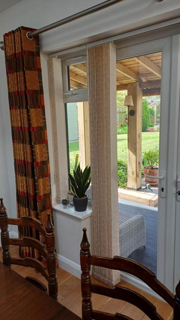 • 100% Polyester • 2 x side panels - Maximum width 47.5 cm, maximum drop 142 cm • Side panel louvres stack to the side • 1 x main panel - Maximum width 138 cm, maximum drop 180 cm • Main panel louvres can be centre split to stack either side • 9 cm