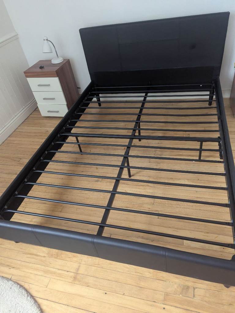Free leather TV bed King size frame V sturdy All slats in tact Just some leather coming away from headband as in picture TV not included No mattress