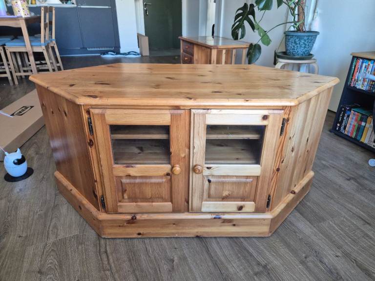 Lovely Ducal TV stand made of solid pine with glass doors and two shelves inside with a pull out drawer inside.130cm wide x 60cm deep x 58cm high. Available collection only in Shepherds Bush, London. Happy to do a deal with this and the listed coffee