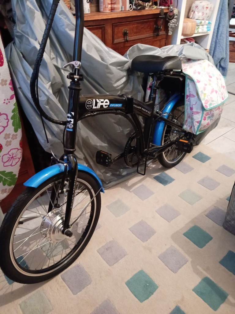 Never Used, E - Life folding bike with shimano gears, battery and charger. Comfort seat fitted, comes with adult helmet, lock, pump, bell, panniers and cape. I'll health forces sale. Buyer collects.