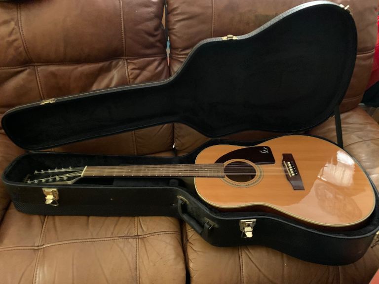 Beautiful Epiphone 12 string acoustic guitar Excellent working order £70 without case - £100 with the case Sadly the headstock required reglueing and two pieces of purpleheart hard wood dowel snuggly inserted to maintain strength but it now plays