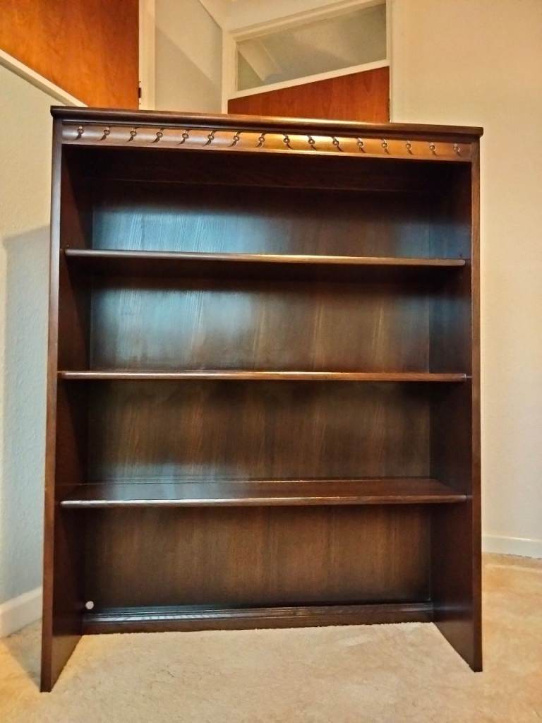 Double Top Unit, 583B, in Old Colonial dark wood. One fixed shelf and two removable with adjustable positions. Fits onto same width Ercol base unit. Complete with original shelf hangers and metal brackets and wooden dowels for fixing to base unit. 98