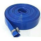Brand new blue lay flat hose, perfect for water pump discharge. It comes with a metal clamp for secure fitting, ready for use. Flexible and durable material, still in its original rolled state. Ideal for irrigation, drainage, or general water transfe