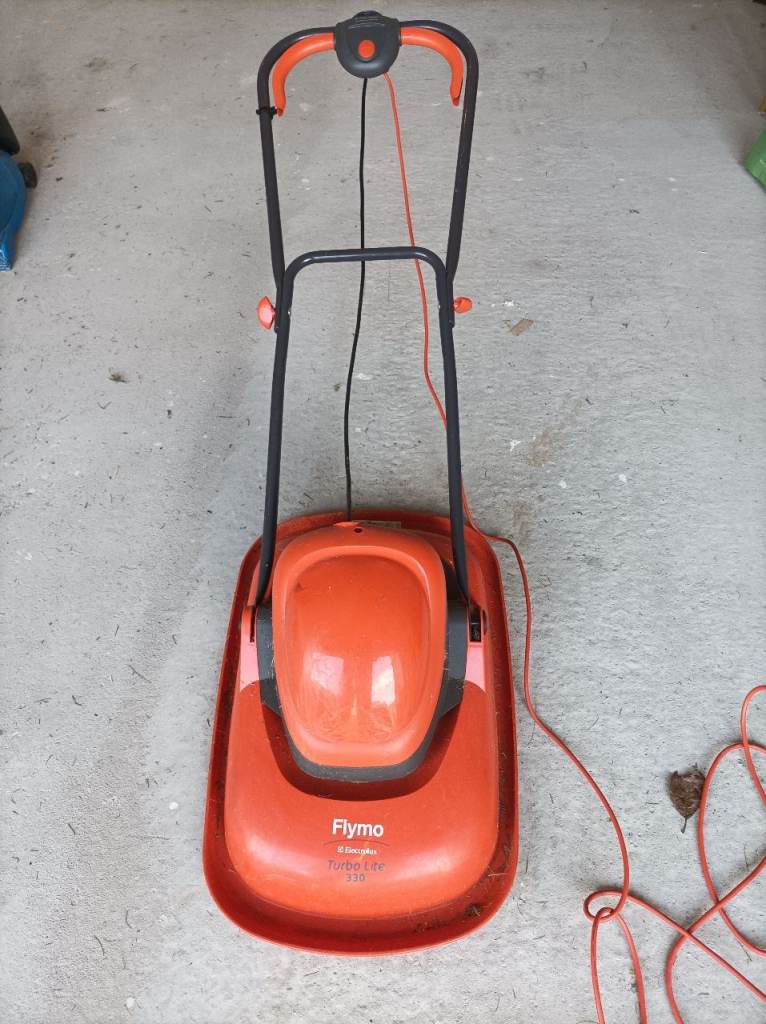 Traditional hover Flymo. No grass box with this model. Seldom used. Suitable for small garden?