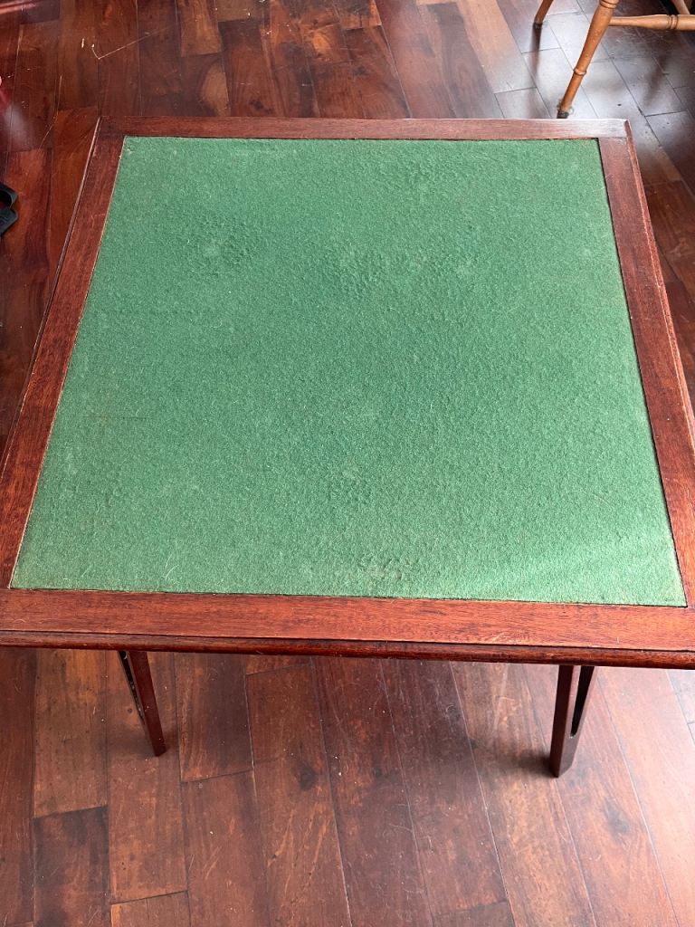 Vintage Foldaway Card Table on castors, in good condition. 75cm tall x 69cm wide x 40cm deep. Opens to 89xm wide x 68cm, with storage, & maroon original baize interior card playing surface 66cm x 54cm. Great Hall Table or Sidetable. COLLECTION