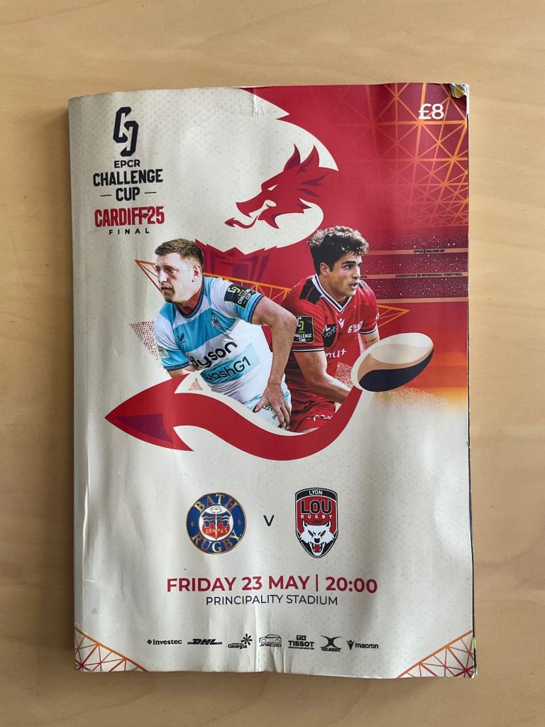 Genuine match day programme from the Bath versus Lyon match held at the Millennium Stadium in Cardiff on 23rd May 2025. In good condition with some creasing and (dried) water marks. Sale benefits a local care charity, Collection from Shawlan
