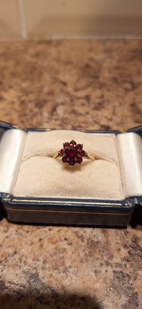 A lovely vintage 9ct gold Garnet cluster ring in excallent condition. Size O Fully hallmarked