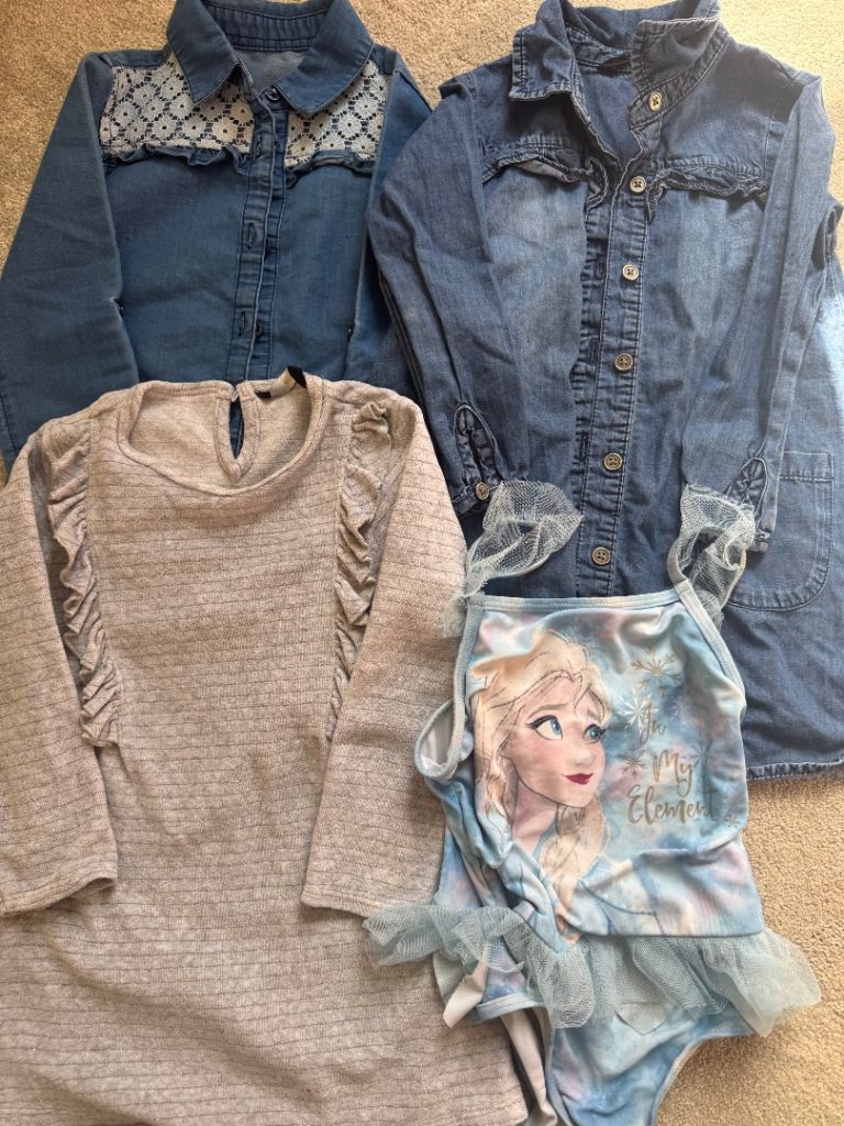 Girls 2-3 clothes bundle denim dress, shirt, grey dress & Disney Frozen swimming costume