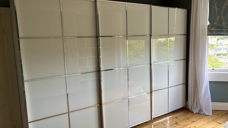 Nolte Attraction 330cm wardrobe in polar white/ white glass in good condition. Comes with internal drawers, shelving and rails. Currently in storage. Delivery within the Bath/ Bristol area can be arranged if required. Was £3k when new. Would be