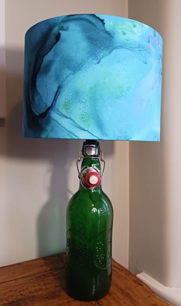 Extra large Grolsch bottle converted to a lamp and topped off with one of my handmade 30cm diameter lampshades. SUPER SPECIAL PRICE OF £30 plus postage