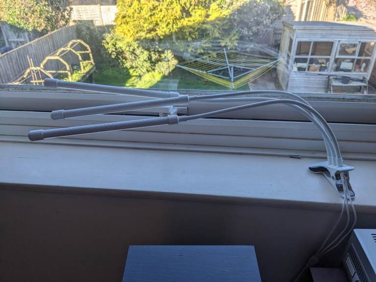 SUWITU brand grow lights. 144 LED. 60W full spectrum. 10 dim levels. 3 modes. Timer for 3,9 and 12 hours. Can be screwed onto a surface, or clipped onto something. Length of arm 83 cm approx.