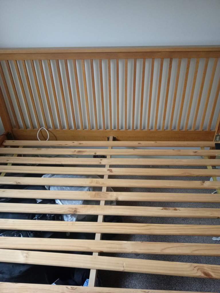 Great super king bed, moving house and no room to take. Need gone asap by Saturday. Selling cheap 2 slat broken but sure can be replaced.