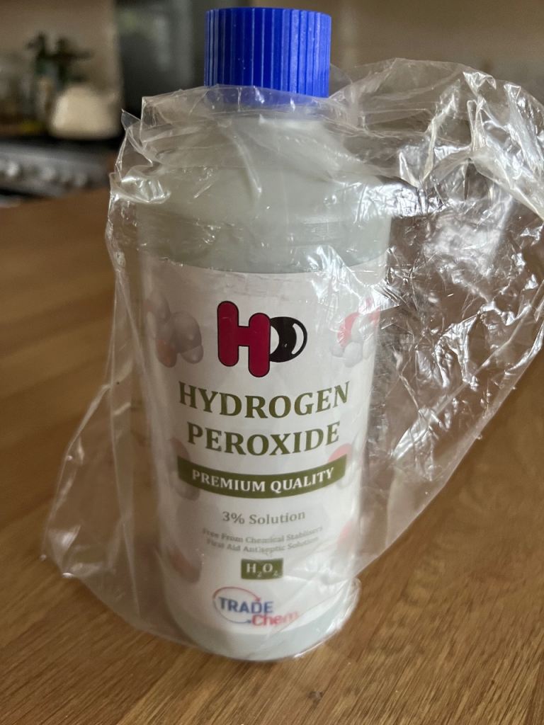 An almost full 500ml bottle of hydrogen peroxide. 3% solution. Great for cleaning mold, removing stains, sterilising equipment and wounds etc.