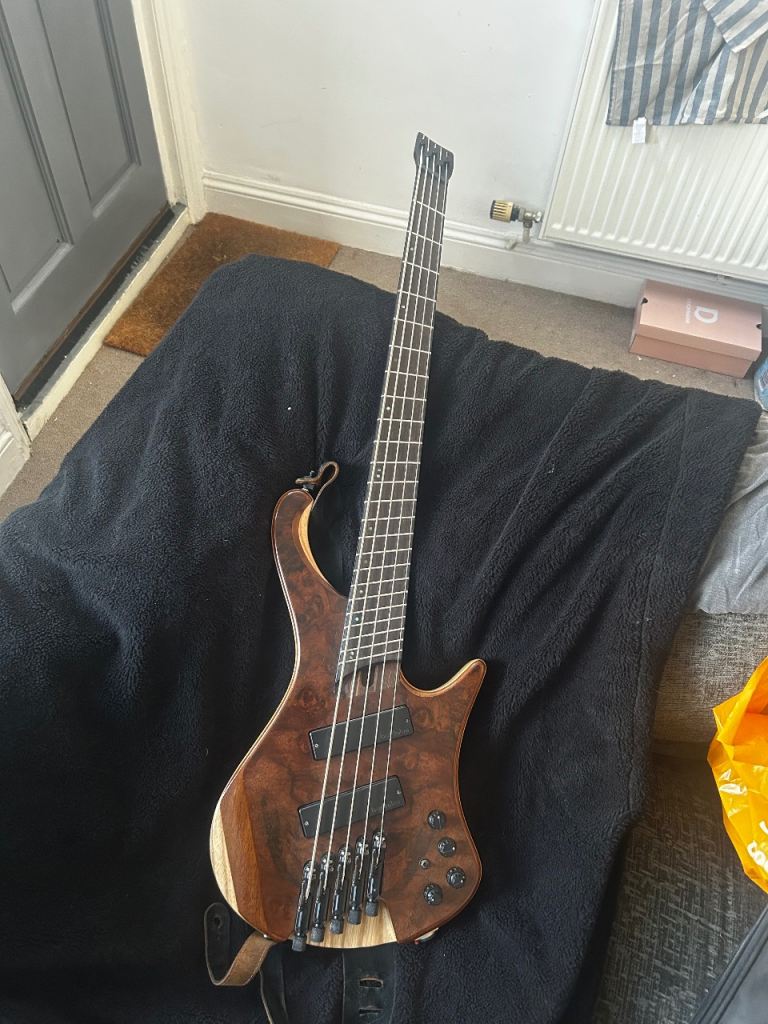 For sale - Left Handed Ibanez 5 String SR375EL Soundgear Active bass in aged whisky burst. 24 fret neck with Ibanez PowerSpan humbucking pickups channelled through an Ibanez custom preamp with a Power Tap Switch and a three-band EQ. The Power Tap swi